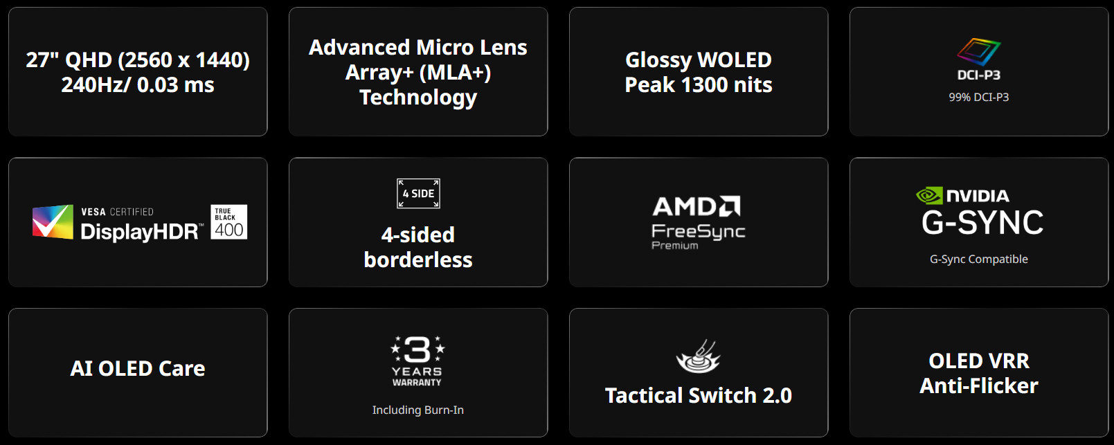 Gigabyte GO27Q24G dibangun di atas panel WOLED berukuran 27 inci dari LG Display dengan resolusi tajam 2560 x 1440 (QHD). Keunggulan utamanya terletak pada penggunaan teknologi MLA+ (Micro Lens Array) milik LG Display yang mampu mendongkrak tingkat kecerahan tipikal hingga 275 nits, dengan tingkat kecerahan puncak (peak brightness) mencapai 1300 nits.
