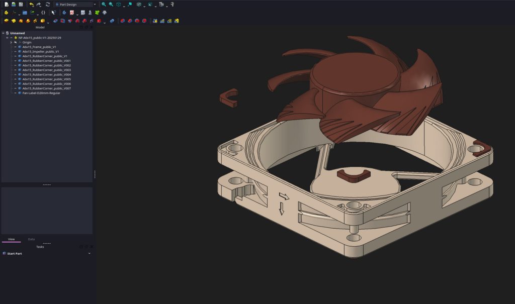 Saat menelusuri model CAD tersebut, terdapat satu detail menarik: Noctua memublikasikan produk dengan struktur bodi yang terpisah. Hal ini sangat berguna jika Anda ingin memodifikasi atau mencetak 3D komponen tertentu, misalnya mencetak ulang sudut karet peredam getaran (anti-vibration pads) yang hilang.